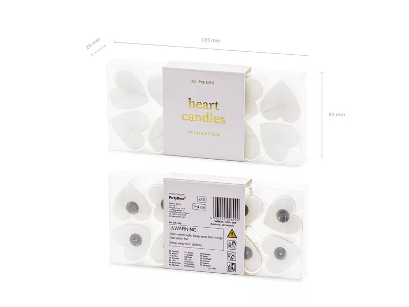 Ezek a szív alakú teamécsesek romantikus és meghitt hangulatot teremtenek bármilyen alkalomra. Fehér színük és elegáns formájuk miatt tökéletesek esküvőkre, romantikus vacsorákhoz, Valentin-napi dekorációkhoz vagy ünnepi asztaldíszítéshez. A csomag 10 db mécsest tartalmaz, melyek kb. 2 órán keresztül égnek.