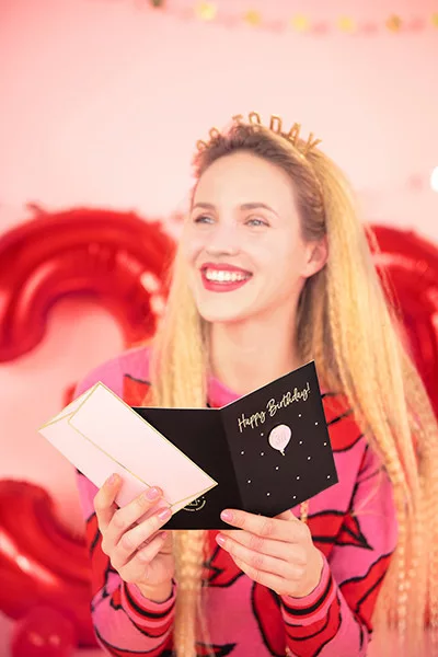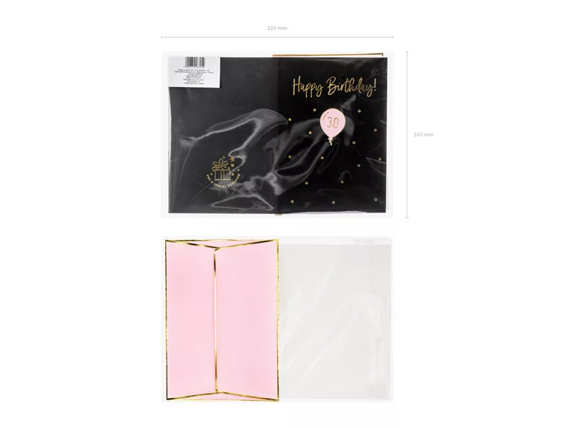 Lepd meg szeretteidet ezzel az exkluzív, fekete színű kártyával, amelyet arany metálnyomattal díszítettek. A kártya különlegessége egy „30” feliratú léggömb formájú zománc kitűző, amely garantáltan emlékezetessé teszi az ünnepet. A készlet tartalmaz egy rózsaszín borítékot is, arany metálnyomattal, amely tovább fokozza a luxus érzetet.