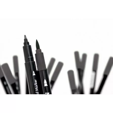 Dupla hegyű tinta toll. A vékony fele kommentek írására alkalmas, a vastag ecsetszerű fejével festhetünk, árnyékolhatunk vagy közvetlenül a bélyegzőre felvíve, színes lenyomatokat készíthetünk.