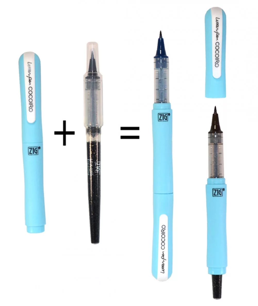 A Kuretake Zig Letter Cocoiro ecsettoll teste sima formájú és szupersima felületű, az utántöltők vízben oldódó tintája pedig szép tintafolyást biztosít.