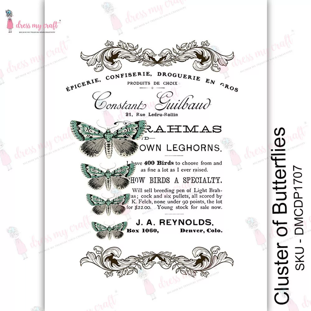 Dress My Craft Transfer Me, vízzel aktíválható transzfer fólia. Méret: Egy csomag 1 db A4-es lapot tartalmaz. Minta: Cluster of Butterflies