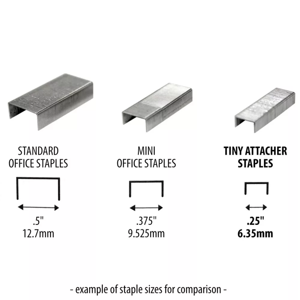 A Tiny Attacher tűzőgép készlet 100 apró tűzőkapcsot tartalmaz. A kapcsok méretei:~6,35mm (.-25"). Az utántöltők külön vásárolhatók meg.