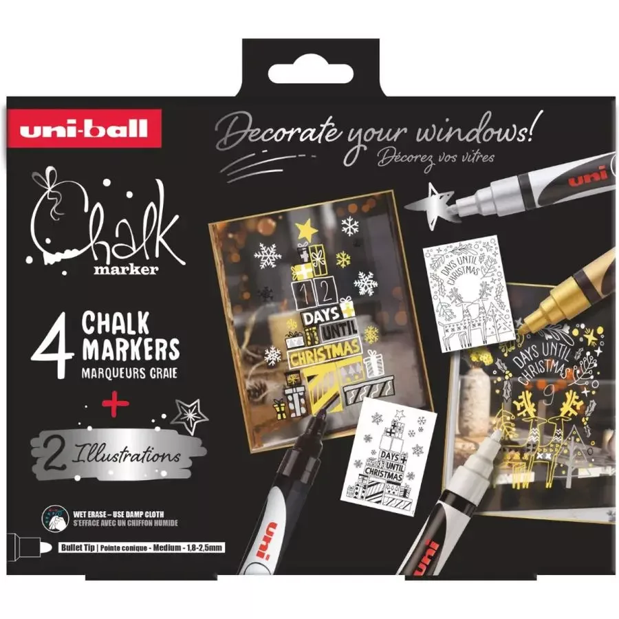 A UNI skandináv kréta marker készlet, ideális ideiglenes és ünnepi dekorációk készítésére otthon. Ezek a markerek kiválóan használhatók táblákon, fehér táblákon, üvegen és más felületeken, mivel esőálló tintájuknak köszönhetően kültéren is tökéletesek. Könnyen letörölhetők egy nedves ruhával. A markerek újrahasznosított műanyagból készülnek, kúpos poliészter heggyel, ami precíz alkalmazást tesz lehetővé. A készlet tartalmaz sablonokat karácsonyi dekoráciohoz, így szórakoztató programot kínál az egész család számára.