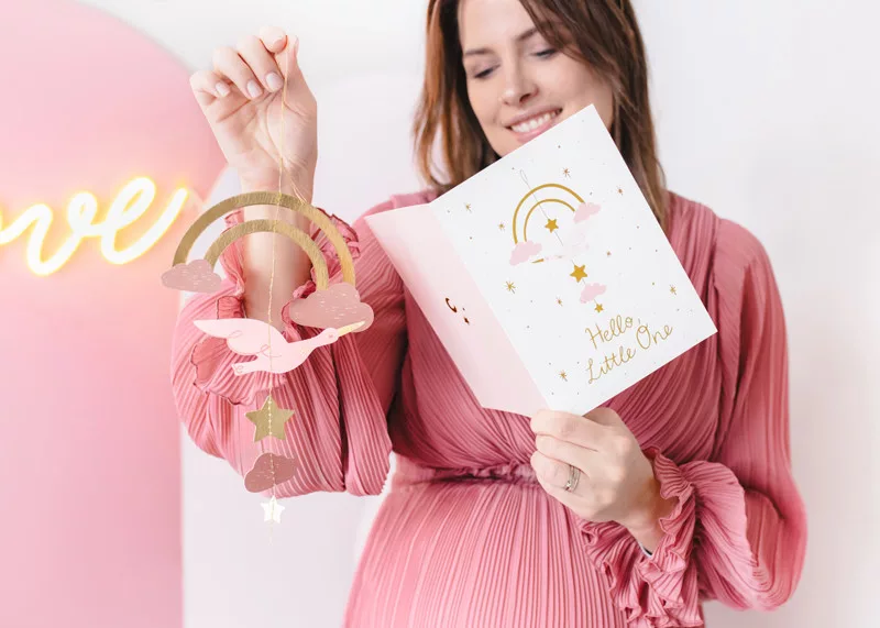 Küldj egy szép üdvözlőlapot a kisbabát váró szülőknek ezzel a világos rózsaszín színű, sgólya díszítésű kártyával! A csomag mindent tartalmaz, melyekből könnyedén elkészíthető a háromdimenziós díszítés. A kártya mérete kb. 14 x 20 cm, tökéletes választás baba érkezésének ünneplésére. A kártya szép és egyedi módja annak, hogy gratulálj a szülőknek és szebbé tedd a nagy napot!