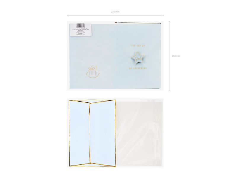 Lepd meg édesapádat ezzel az elegáns, kék színű üdvözlőlappal, amelyet arany metálnyomattal díszítettek. A laphoz tartozik egy csillag alakú zománc kitűző „Dad” felirattal, amely tökéletes módja annak, hogy kifejezd szeretetedet és megbecsülésedet. A csomag egy stílusos, kék borítékot is tartalmaz, arany metálnyomattal.