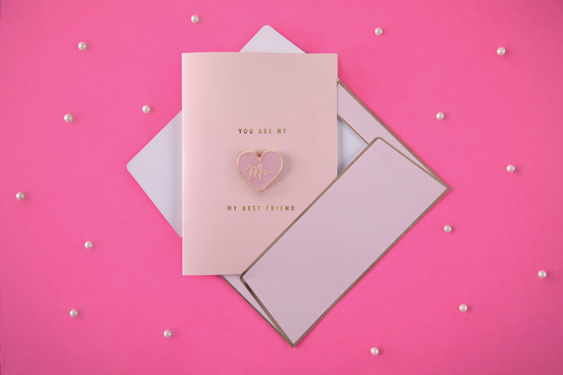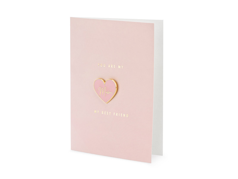 Üdvözlőlap „Mom” feliratú zománc kitűzővel