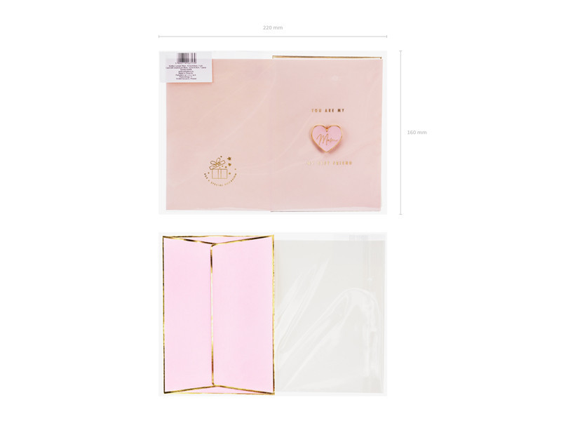 Lepd meg édesanyádat ezzel a gyönyörű, rózsaszín üdvözlőlappal, amelyet arany metálnyomattal díszítettek. A kártyához tartozik egy szív alakú zománc kitűző „Mom” felirattal, amely szívhez szóló és maradandó ajándék. A csomag része egy stílusos, rózsaszín boríték is, arany metálnyomattal.