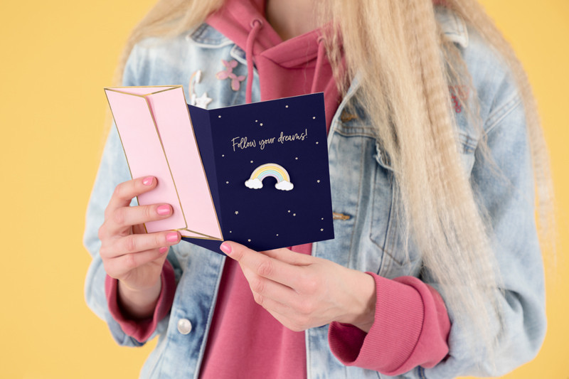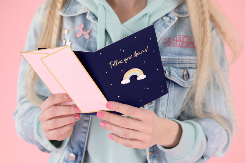 Ez az üdvözlőlap tökéletes választás születésnapra, ünneplésre vagy bárminemű alkalomra, amikor szeretnéd inspirálni és bátorítani a másikat. A szivárvány alakú kitűző és a „Follow your dreams” felirat remek emlékeztető arra, hogy sose adják fel álmaikat.