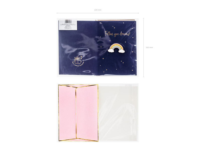 Lepd meg valakit különlegessel ezzel a gyönyörű, tengerészkék üdvözlőlappal, amelyet arany metálnyomattal díszítettek. A laphoz tartozik egy szivárvány alakú zománc kitűző „Follow your dreams” felirattal, amely a remény és az álmok követésére inspirál. A csomag része egy rózsaszín boríték, szintén arany metálnyomattal.