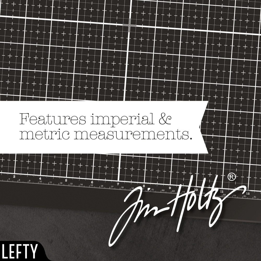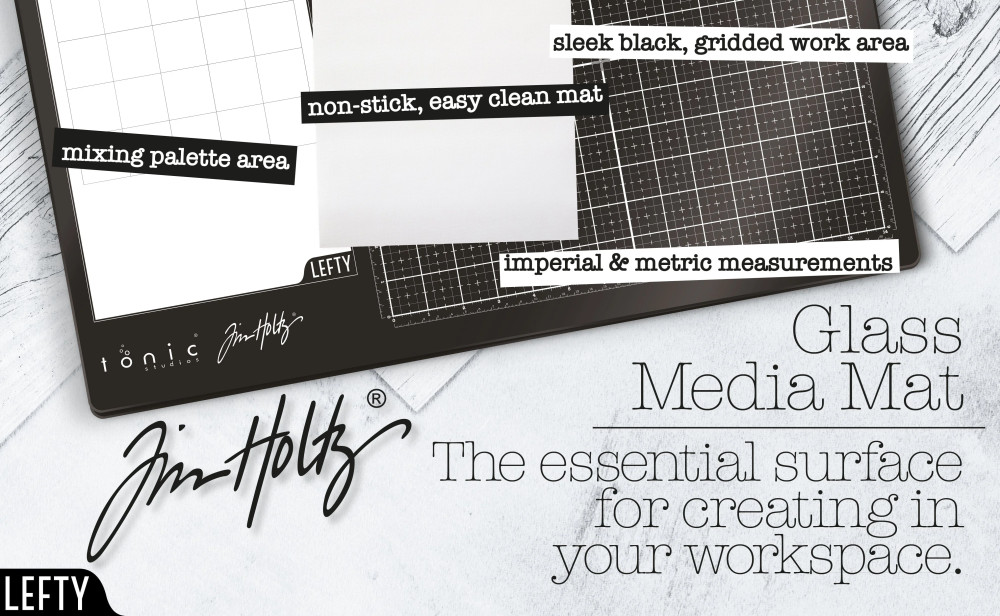 A 14" x 23" (35,5 cm x 58,3 cm) méretű, elegáns fekete felülettel rendelkező Tim Holtz Glass Media Mat egy fantasztikus, többfunkciós eszköz. Az alátéten a mérőrács inch és centiméter osztásban is fel van tüntetve, az oldalán található fehér 7,5" x 11" (19 cm x 27,9 cm) keverőpaletta pedig (egy tartós, könnyen tisztítható tapadásmentes szőnyeggel kiegészítve) ideális a nedves közegek elkészítéséhez.