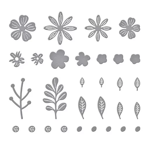 A Spellbinders "Mini Blooms and Sprigs" vágósablon egy nagyon kedves és sokoldalú készlet, amely különböző virágokat és levelekt tartalmaz. Ez a készlet ideális választás lehet kártyák, scrapbook oldalak és egyéb papíralapú kézműves projektek díszítésére.
