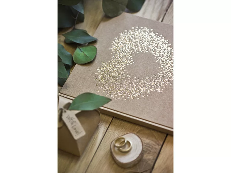 Ez a kraft papírba kötött vendégkönyv elegáns arany díszítéssel tökéletes választás bármilyen különleges alkalomra. A természetes megjelenés és az arany ornamentum kombinációja stílusos és emlékezetes módot biztosít a vendégek üzeneteinek megőrzésére.