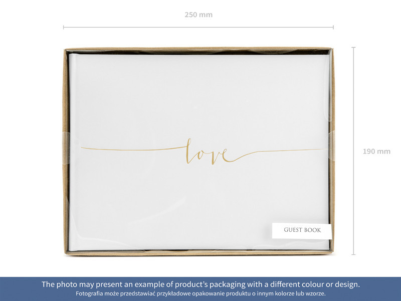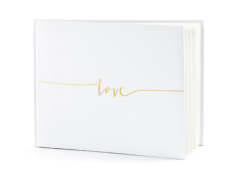 Ez a fehér papírba kötött vendégkönyv elegáns arany "Love" felirattal tökéletes választás bármilyen különleges alkalomra. Az egyszerű, mégis stílusos megjelenésével emlékezetessé teszi az eseményt, és helyet biztosít a vendégek jókívánságainak és emlékeinek.