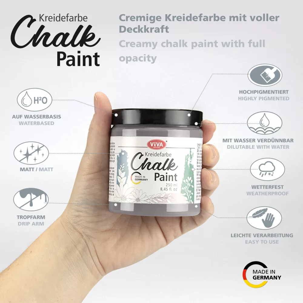 A Viva Decor krétafesték magas pigmentáltsága és fedőképessége biztosítja, hogy kevesebb erőfeszítéssel és kevesebb festékfogyasztással optimális eredményt érj el. A festék mattra szárad, és púderes-bársonyos felületet hagy maga után. És a legjobb az egészben, hogy a "Chalk Paint" porózus és nem porózus felületekre egyaránt alkalmas.