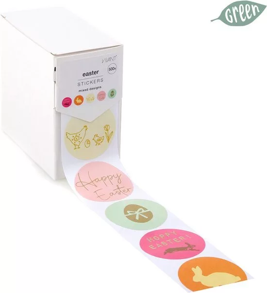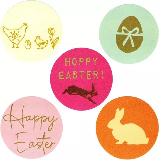 Húsvéti matricák dekoratív ajándékcímkék, Ø40 mm méretben, 5 különböző designnal. A tekercs 500 darab matricát tartalmaz, amelyek tökéletesek húsvéti csomagok, ajándékok vagy dekorációk díszítéséhez.