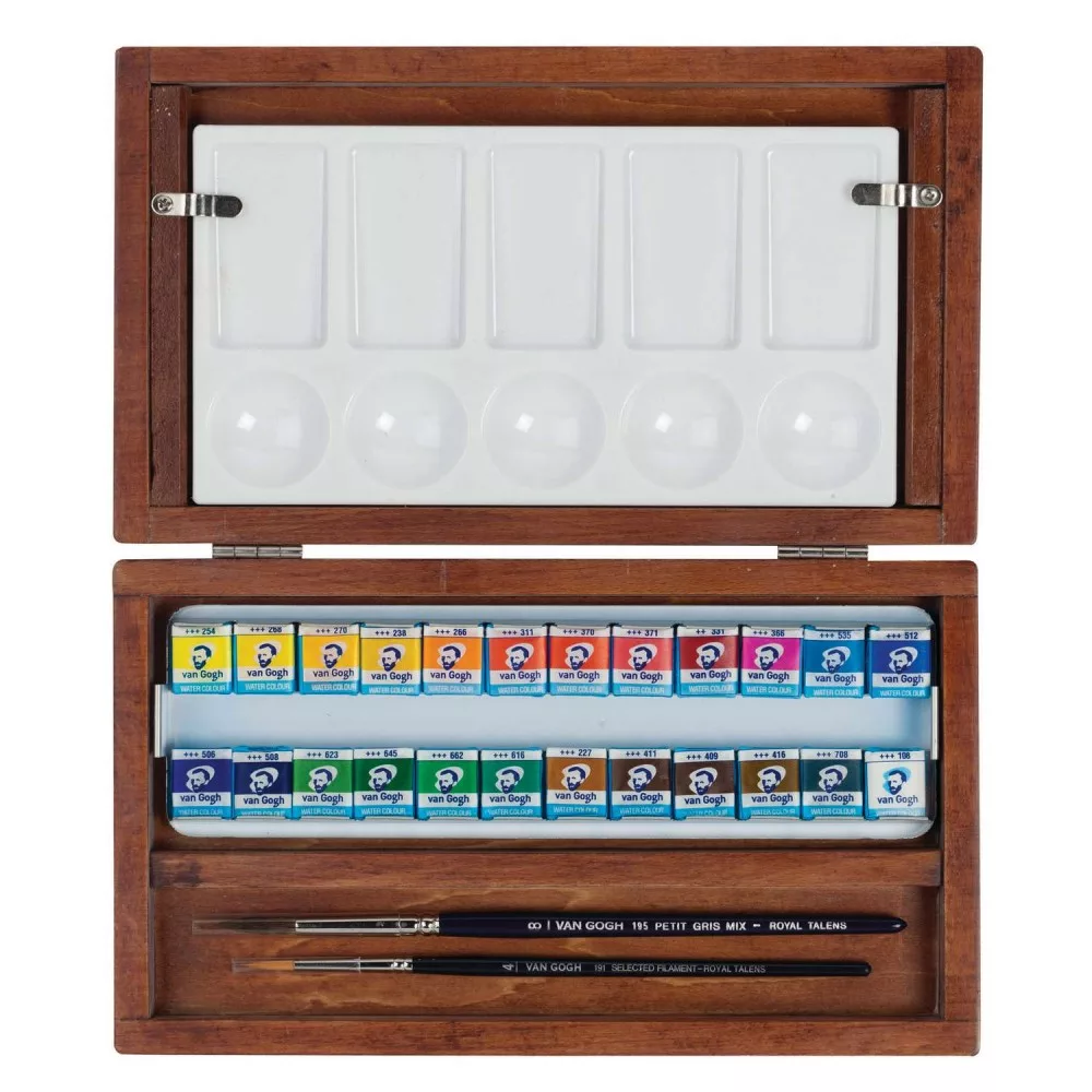 24 db 1/2 szilke Van Gogh akvarellfesték: Permanent Lemon Yellow 254, Azo Yellow Light 268, Azo Yellow Deep 270, Gamboge 238, Permanent Orange 266, Vermillion 311, Permanent Red Light 370, Permanent Red Deep 371, Madder Lake Deep 331, Quinacridone Rose 366, Cerulean Blue Phthalo 535, Cobalt Blue Ultramarine 512, Ultramarine Deep 506, Prussian Blue 508, Sap Green 623, Permanent Green 662, Hooker Green Deep 645, Viridian 616, Yellow Ochre 227, Burnt Sienna 411, Burnt Umber 409, Sepia 416, Payne's Grey 708, Chinese White 108.