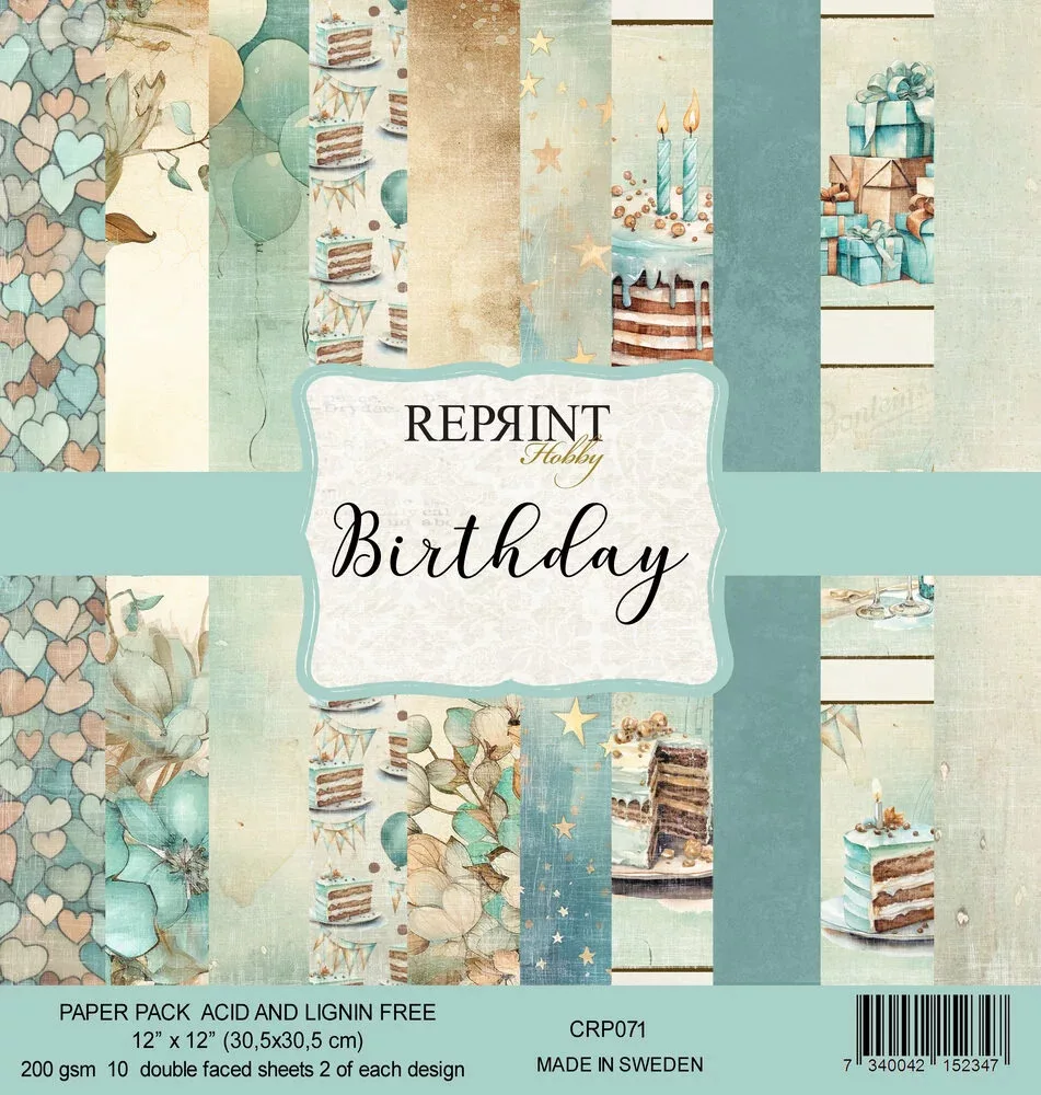 A Birthday készlet 10 db 12x12 Inch (30.48 x 30.48 cm), mindkét oldalán mintás scrapbook papírt tartalmaz. Savmentes és ligninmentes / 200 gsm