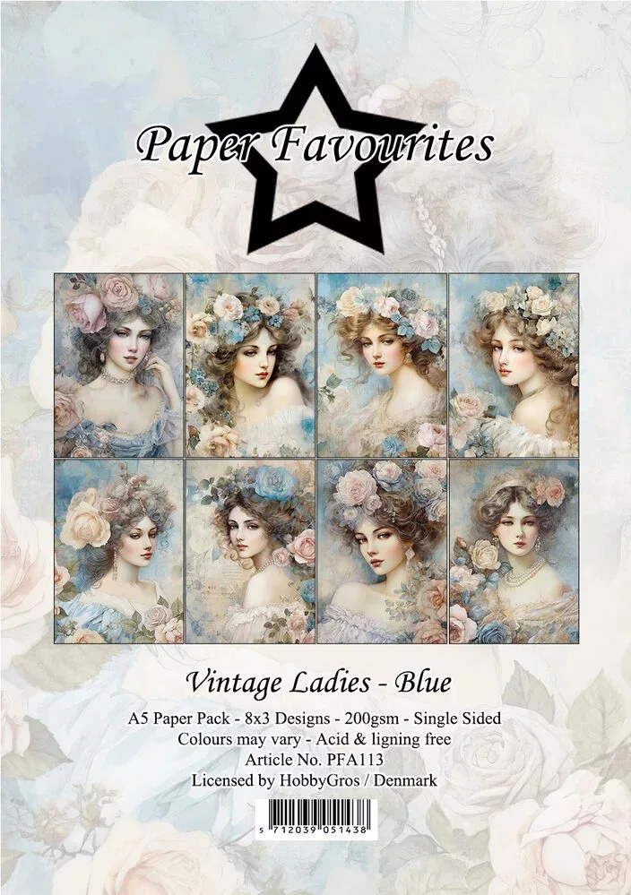 A Vintage Ladies Blue készlet 24 db A5, egyoldalas, mintás scrapbook papírt tartalmaz. Savmentes és ligninmentes (3x8 design) / 200 gsm