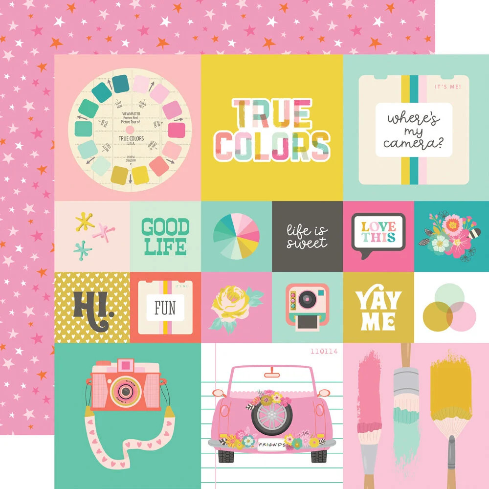 True Colors scrapbook papírkészlet és matrica csomag. A készlet tartalma: 12 db 30,48 x 30,48 cm, mindkét oldalán mintás scrapbook papír, 1 ív öntapadós matrica.
