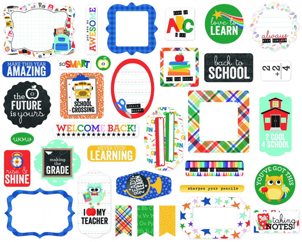 Scrapbook formára vágott díszítőelem készlet. A Off To School kollekció tökéletes kiegészítője.