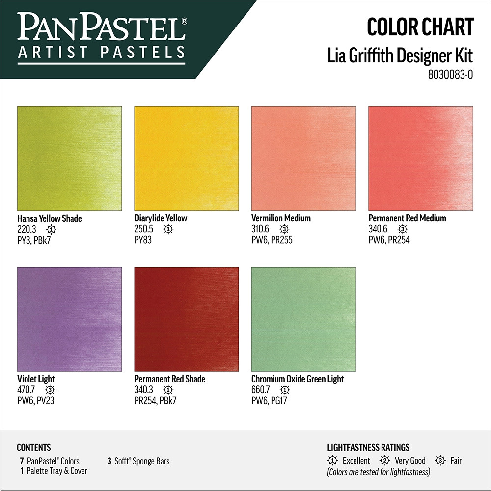 A PanPastel Lia Griffith Designer Kit egy különleges, 7 színből álló válogatás, amelyet a híres designer, Lia Griffith állított össze. A színek tökéletesek modern illusztrációkhoz, papírdekorációkhoz, scrapbookhoz és kreatív vegyes technikákhoz.