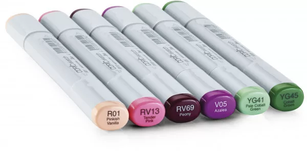 COPIC Sketch grafikai filctoll készlet. Egyik oldalon vágott közép vastag, a másik oldalon ecsetheggyel - Virág kedvencek 1. Színek: R01, RV13, RV69, V05, YG41, YG45