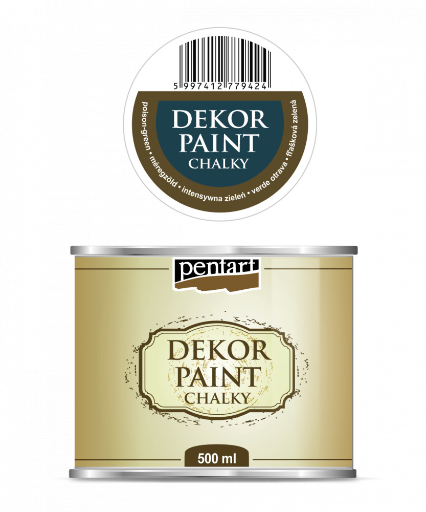 Dekor krétafesték 500 ml méregzöld. DEKORFESTÉK, LÁGY. Kiváló fedőképességű, gyorsan száradó, vízbázisú festék. Különleges összetételének köszönhetően matt, lágy tapintású, sima felületet kapunk, ami könnyen csiszolható. Szinte bármilyen anyagra, így fára, kerámi ára, fémre, kőre, sőt falfelületre is használható. Kiválóan alkalmas kopott, antik hatás elérésére. Különböző színű rétegek egymásra festésével és azt követő csiszolásával változatos stílusú (Vintage, Shabby chic) tárgyakat, bútorokat készíthetünk. A festék felvitele előtt használjunk dekorfesték alapozót. A festett felület száradás utáni viaszolással vagy lakkozással válik időtállóvá.